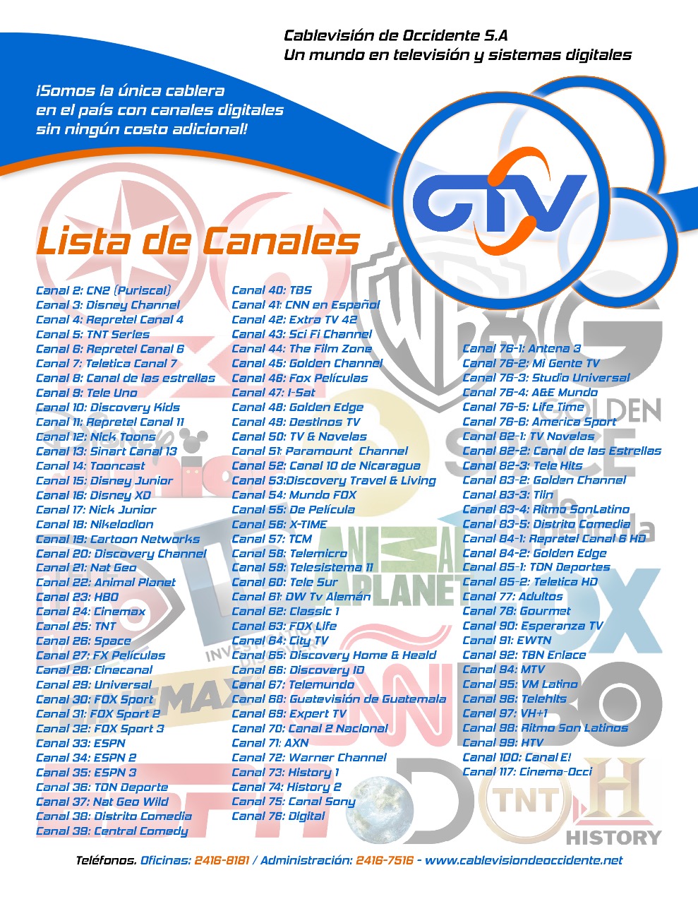 Cablevisión de Occidente S.A le ofrece la mejor grilla de canales de televisión en Costa Rica brindando el mejor entretenimiento en todas las categorias: noticias, deportes, series, películas, telenovelas, documentales y mucho más.